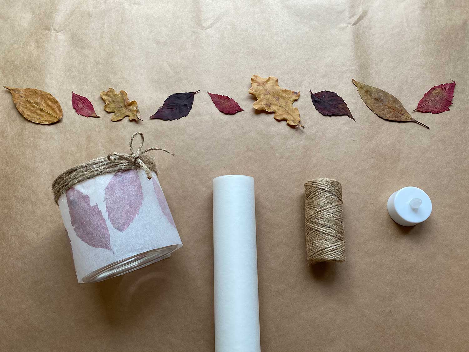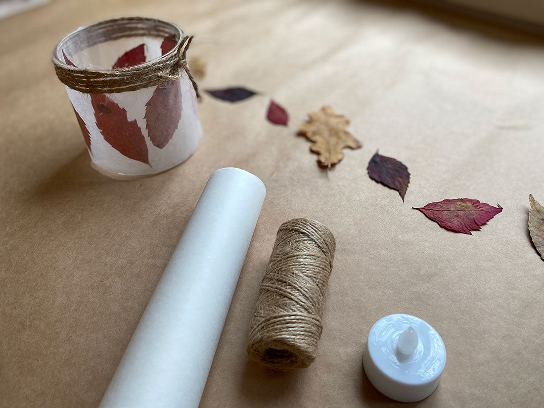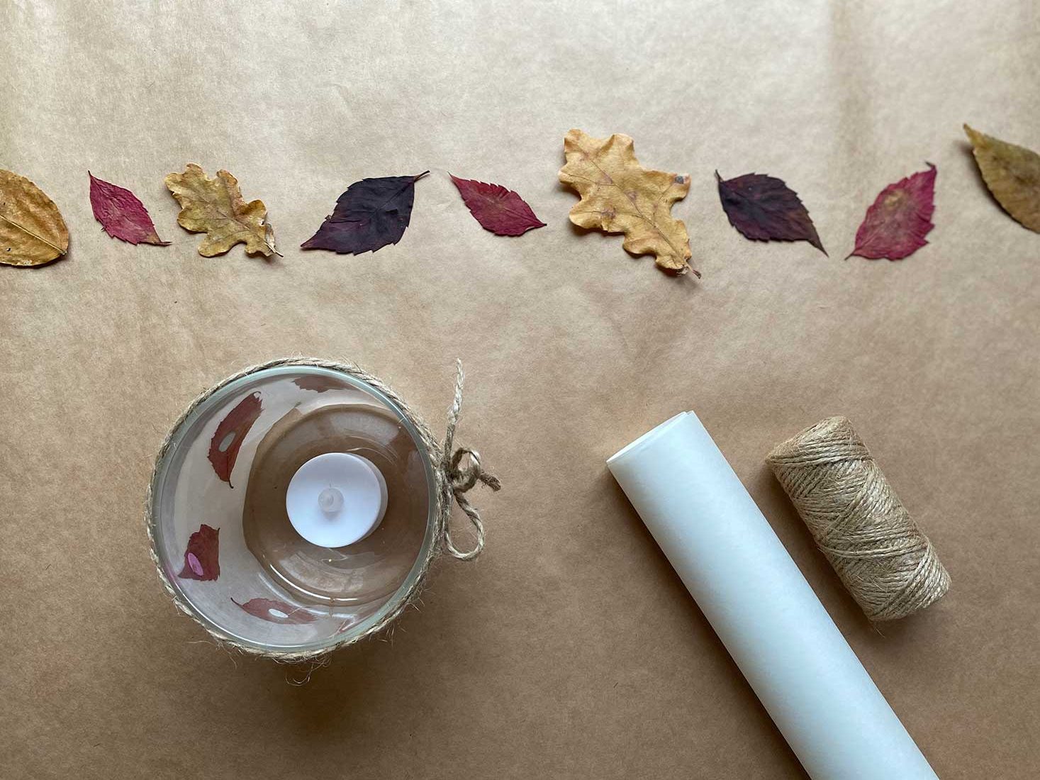 Gdy roślinne dodatki są już przymocowane do naczynia, czas dodać półprzeźroczystą powłokę. Do przygotowania lampiony DIY najlepiej sprawdzi się do tego bibuła w dowolnym kolorze lub papier do pieczenia. Dzięki temu zyskamy bardzo klimatyczne, delikatne oświetlenie. Wycinamy pasek papieru o odpowiedniej szerokości, obtaczamy lampion i zaklejamy.