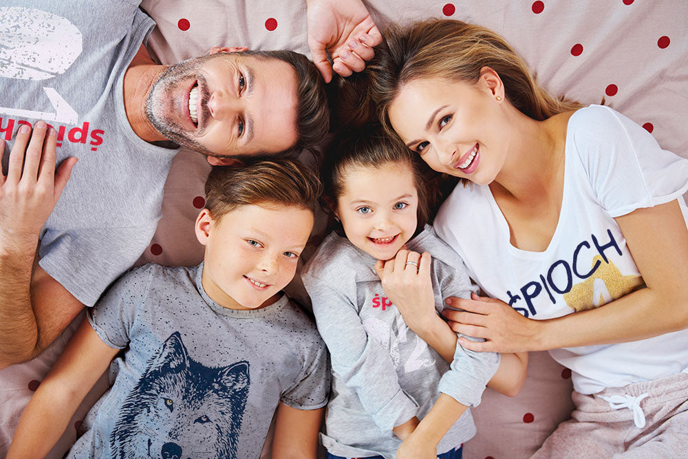 Świetnym piżamowym pomysłem jest rodzinna sesja zdjęciowa w piżamach. Takie zdjęcia popularne są zwłaszcza w sezonie Bożego Narodzenia. Jak wykonać piękne zdjęcia? Znajdźcie jednolite tło, możecie np. położyć się na jasnej kołdrze. Kolejnym szczegółem, od którego będzie zależał klimat zdjęć będą piżamki. Najlepiej wybrać pasujące do siebie kolorystyką i wzorem, w ten sposób zdjęcie będzie estetyczne i spójne. Teraz wystarczy tylko szeroki uśmiech i rodzinne zdjęcie w piżamach gotowe.