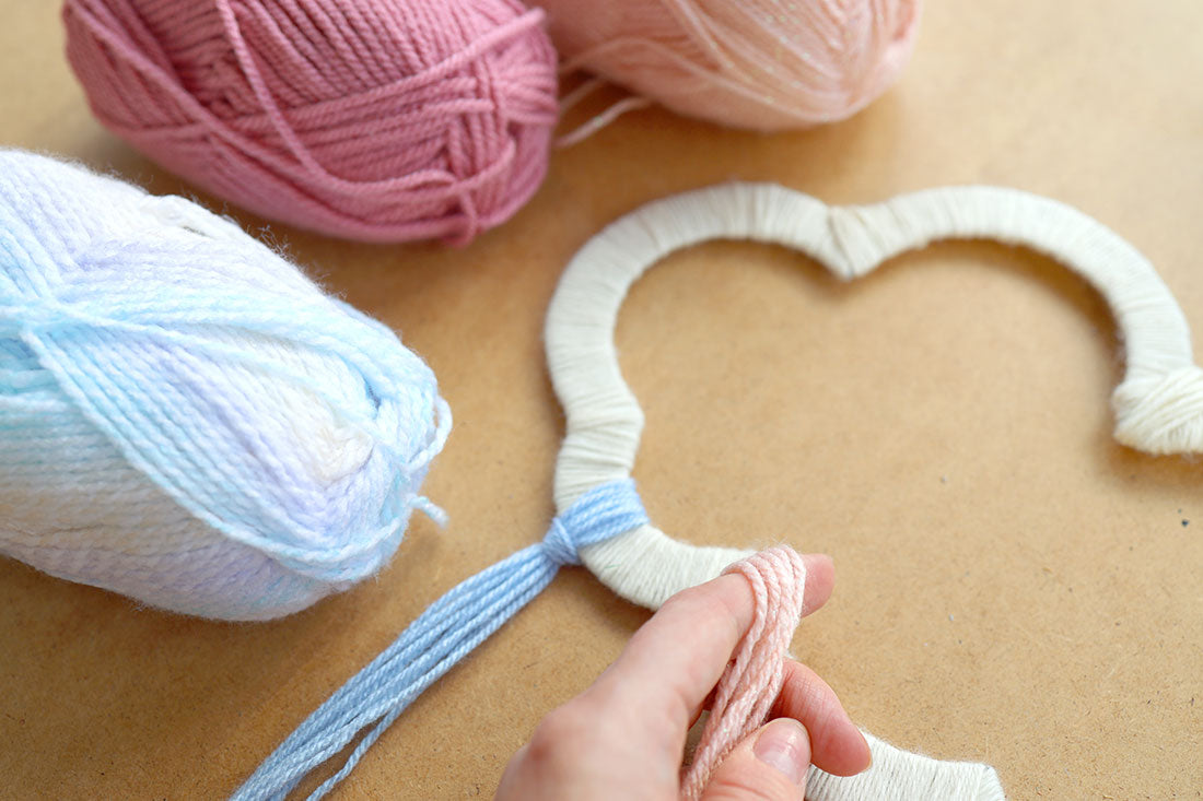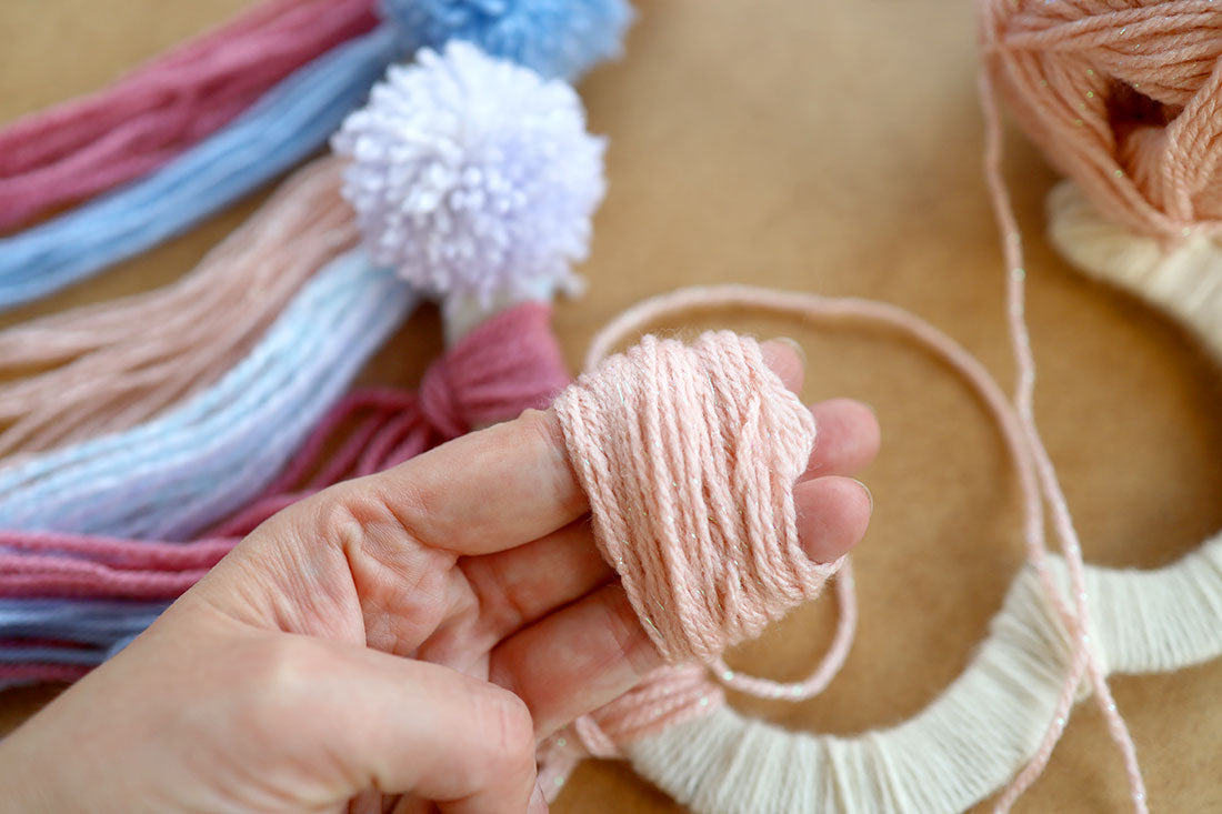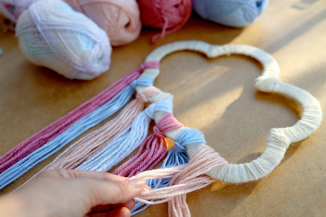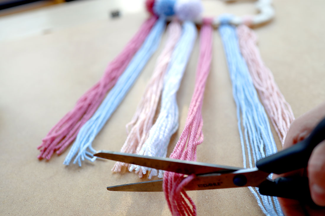 Przymocuj pasma włóczki do dolnej krawędzi ozdoby a następnie wyrównaj długość wszystkich pasm nożyczkami.