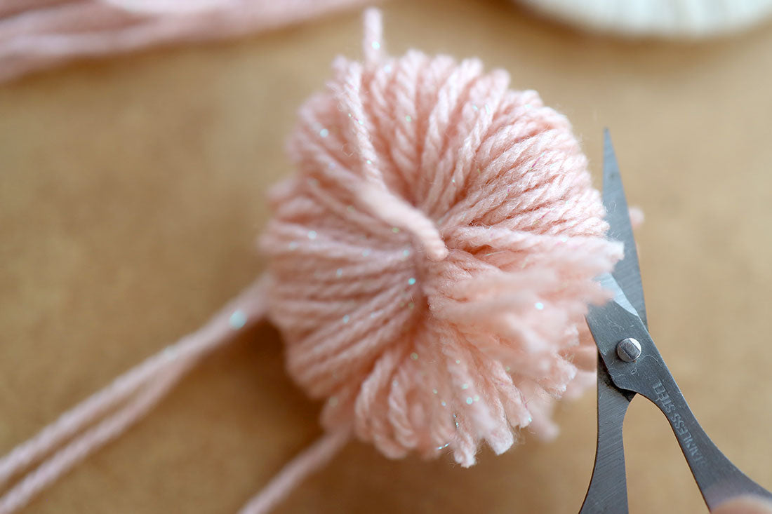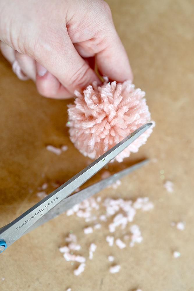 Bezpośrednio po rozcięciu pętelek pompon nie będzie prezentował się zbyt dobrze. Aby wyglądał na bardziej zbity musimy użyć długich nożyczek. Zacznij kształtować kulisty kształt pompona odcinając dłuższe pasma. Po chwili Twój pompon zyska piękny, owalny kształt.