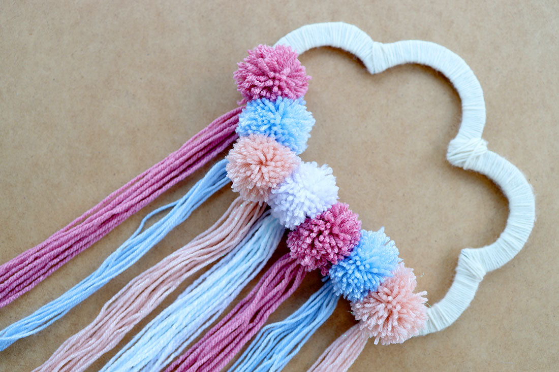 Na koniec przywiązujemy pompony do dolnego brzegu chmurki wg kolorów zwisających pasm.