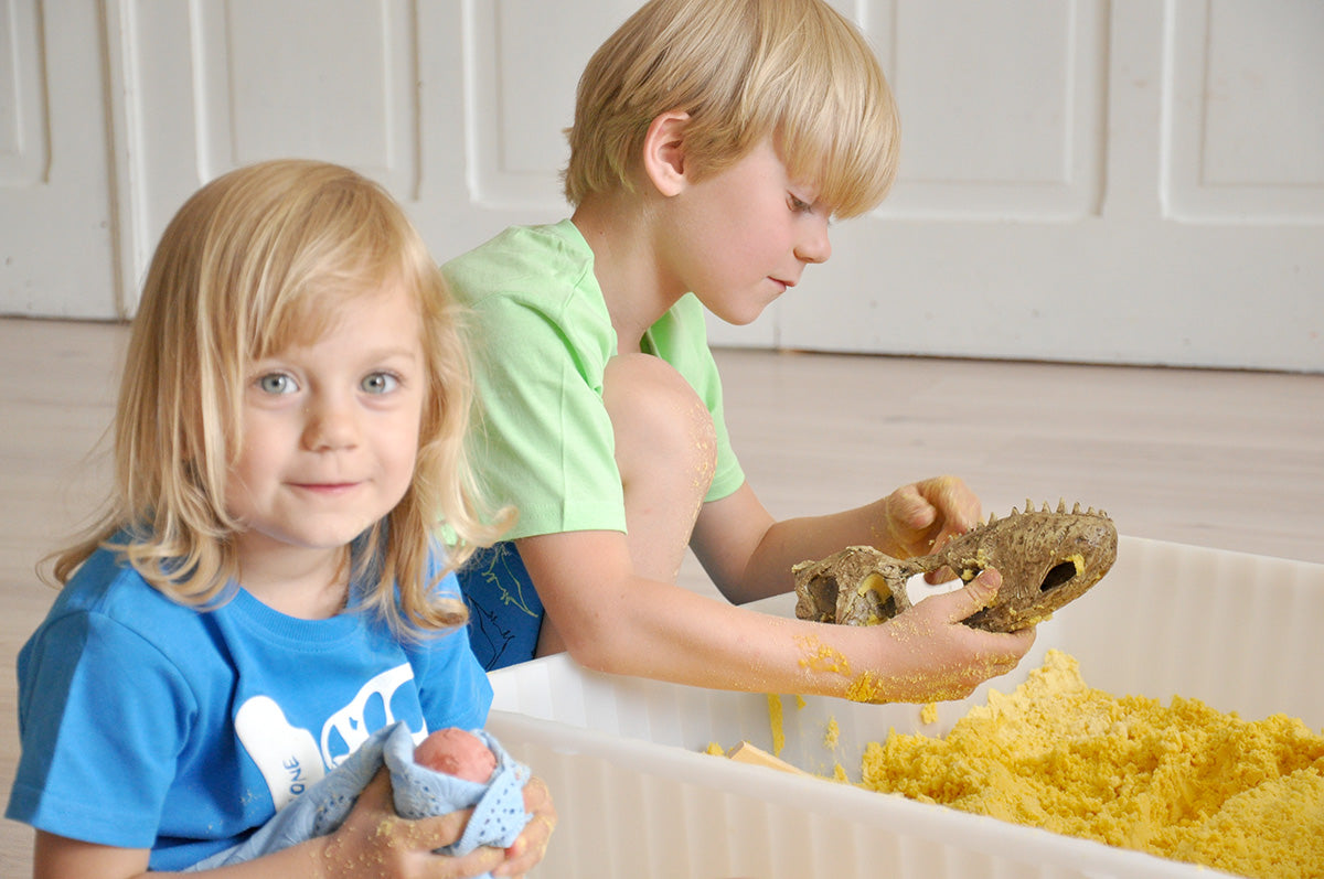 Wszystkie dzieci uwielbiają dinozaury i zabawy w archeologów. Zabawa w wykopaliska jest wspaniałą zabawą sensoryczną stymulującą zmysł dotyku, propriocepcji (czucia głębokiego), węchu i wzroku. Doskonale ćwiczy umiejętność koncentracji uwagi i cierpliwość. Idealna do nauki przyrody i geologii poprzez doświadczanie.
