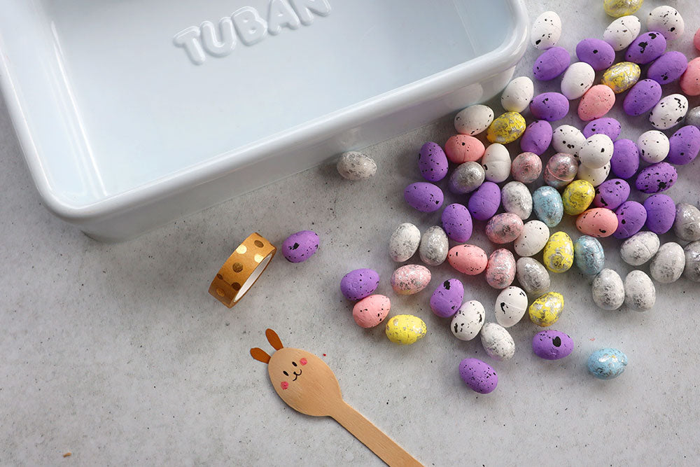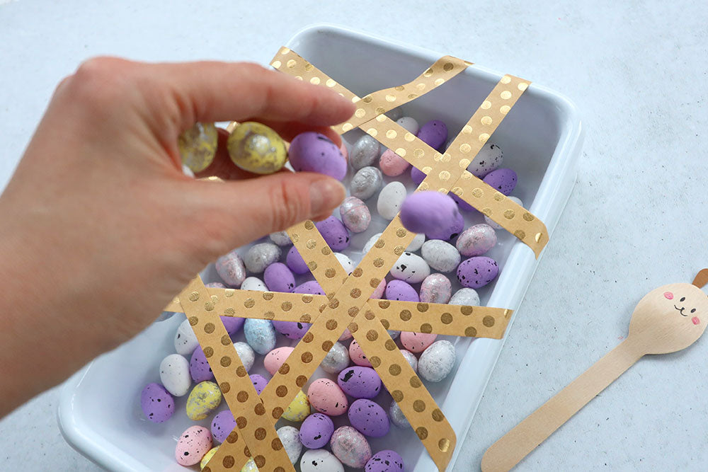 Kiedy mamy już przygotowaną tacę wsypujemy do niej drobne przedmioty, które będą musiały wyłowić dzieci. W wersji wielkanocnej mogą to być piankowe jajeczka. Jeśli chcesz możesz także użyć innych przedmiotów, np. suchej fasoli "Jaś", pomponów, czy nawet drobnych figurek do zabawy.