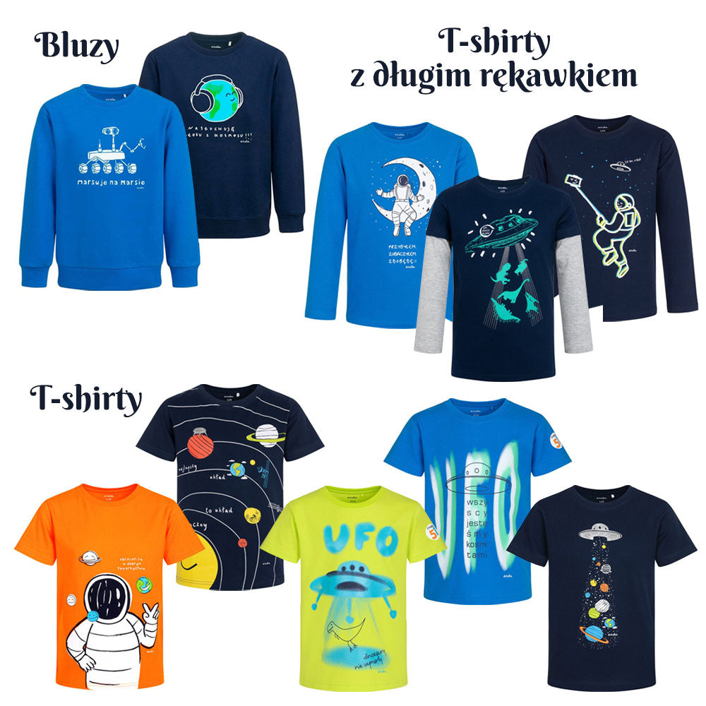 Uniwersalne koszulki i bluzy dla chłopców i dziewcząt to zabawne obrazki z wszechświatem i jego dziwnymi mieszkańcami. Znajdziesz na nich UFO, kosmiczne dinozaury, astronautów koszących księżyc czy zabawne dialogi między planetami Drogi Mlecznej.