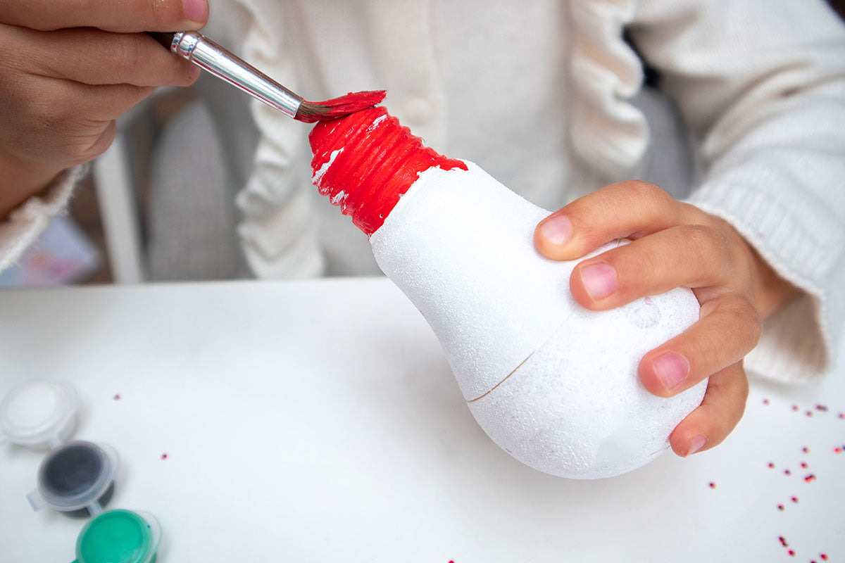 Czerwoną farbą malujemy czapkę bałwanka, czyli metalową część żarówki.