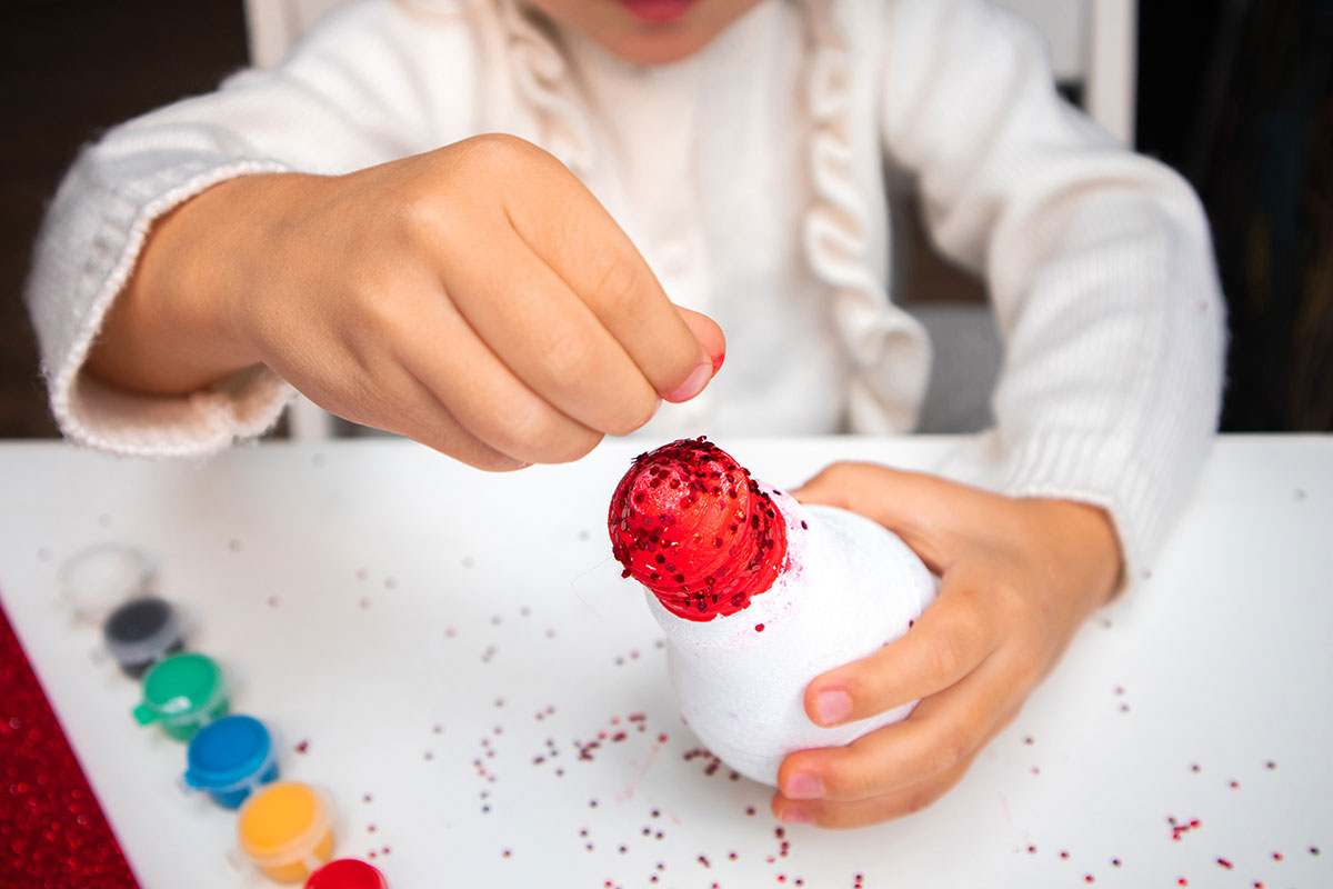Na jeszcze mokrą farbę sypiemy czerwony brokat, dzięki temu czapeczka bałwanka będzie pięknie się świecić.