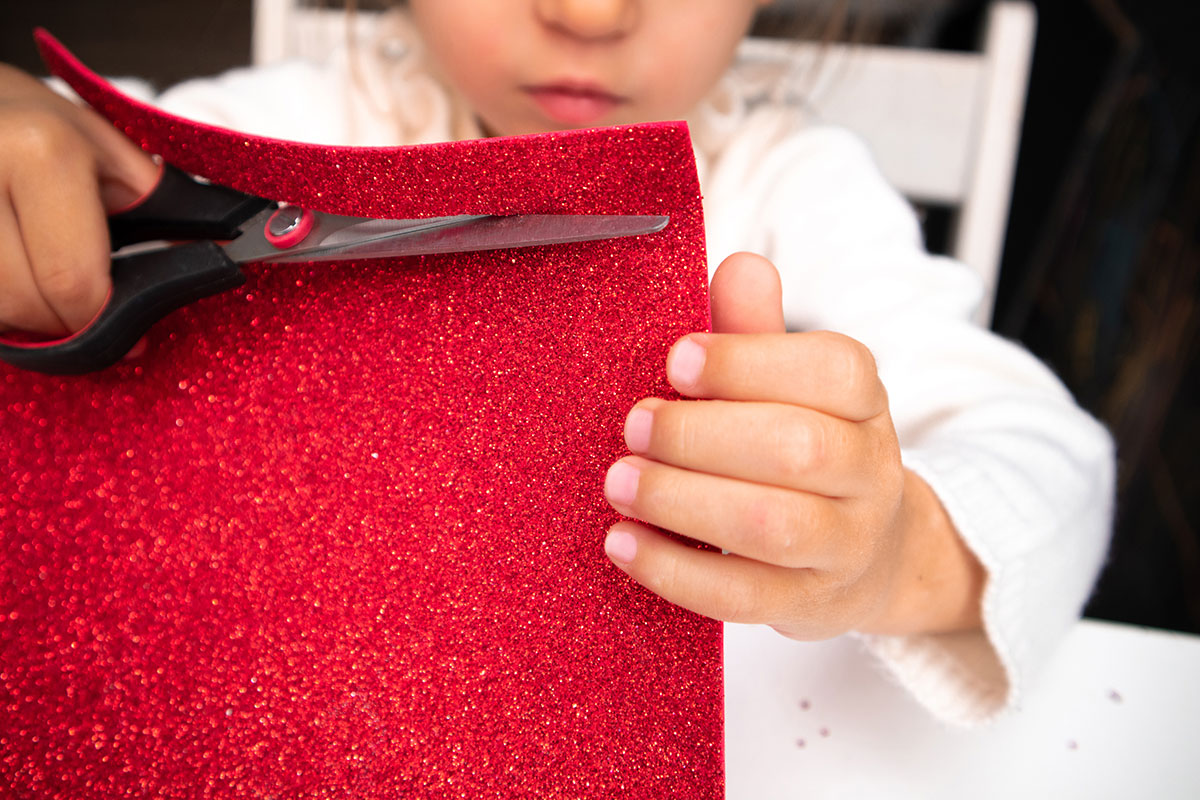 Z czerwonej, brokatowej pianki wycinamy pasek, z którego zrobimy szalik.