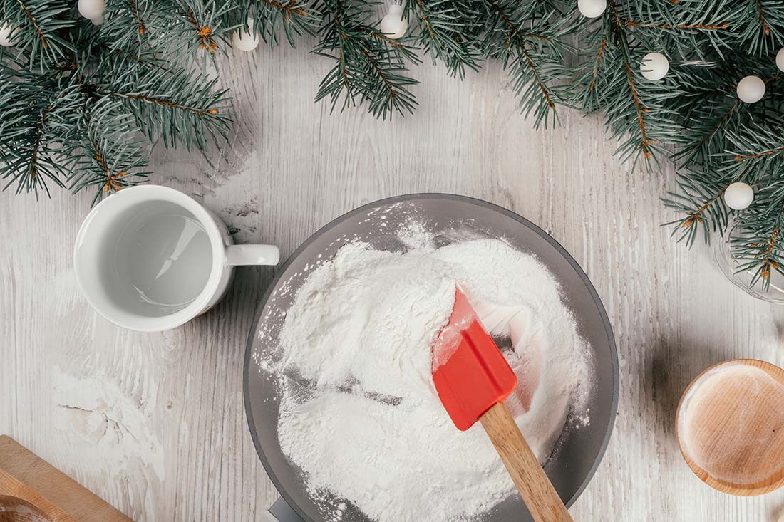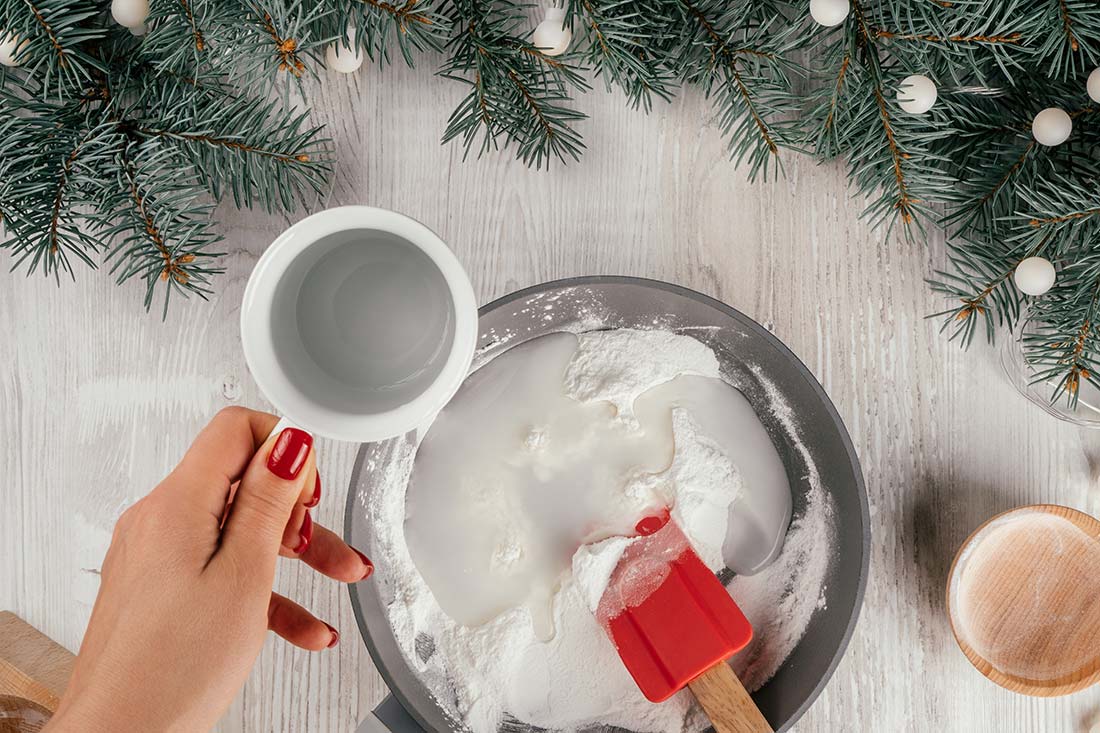 Do naczynia wsypujemy suche sładniki, czyli skrobię kukurydzianą oraz sodę i mieszamy. Następnie dodajemy miarkę wody i wszystko dokładnie mieszamy. Masa musi być gładka, bez grudek.