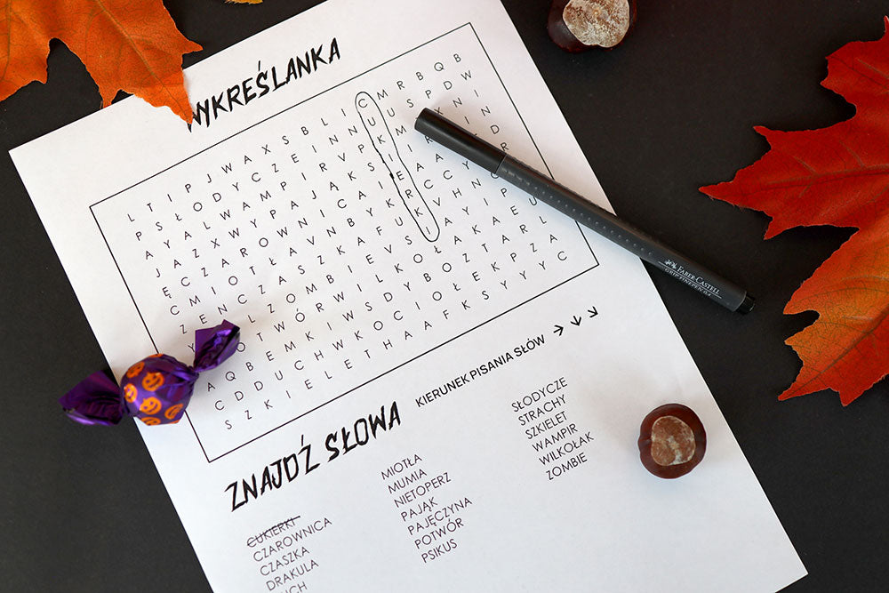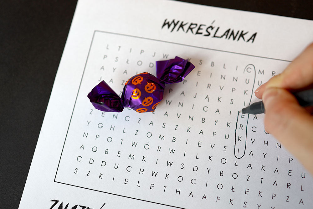 Ostatnie zadanie dla starszaków, które potrafią już pisać i czytać. Wydrukujcie dla każdego uczestnika wykreślankę w halloweenowym klimacie.