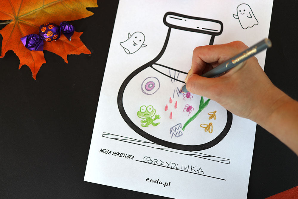 Wszystkie małe czarownice i czarownicy kochają Halloween. Uwielbiają również tworzyć niesamowite i przerażające mikstury magiczne o tajemniczych właściwościach. W tym zadaniu musicie wymyśleć właśnie taką miksturę. Wydrukuj nasz szablon lub na kartce A4 narysuj pusty flakonik na czarodziejski eliksir. Zadaniem maluszka jest zapełnienie go niezwykłymi składnikami, nazwanie swojej mikstury oraz opowiedzenie o jej właściwościach magicznych. Za wykonanie zadania dzieci dostają cukierki.