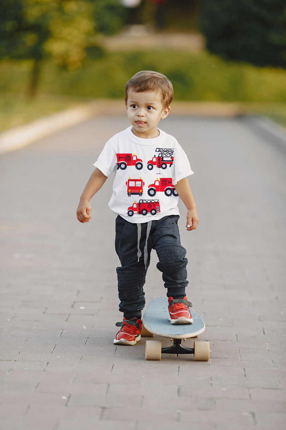 Ten zestaw będzie dobry zarówno dla dziewczynki jak i chłopca. Córce możesz zaproponować również zamiast spodni długie legginsy a zamiast t-shirta dłuższą tunikę.