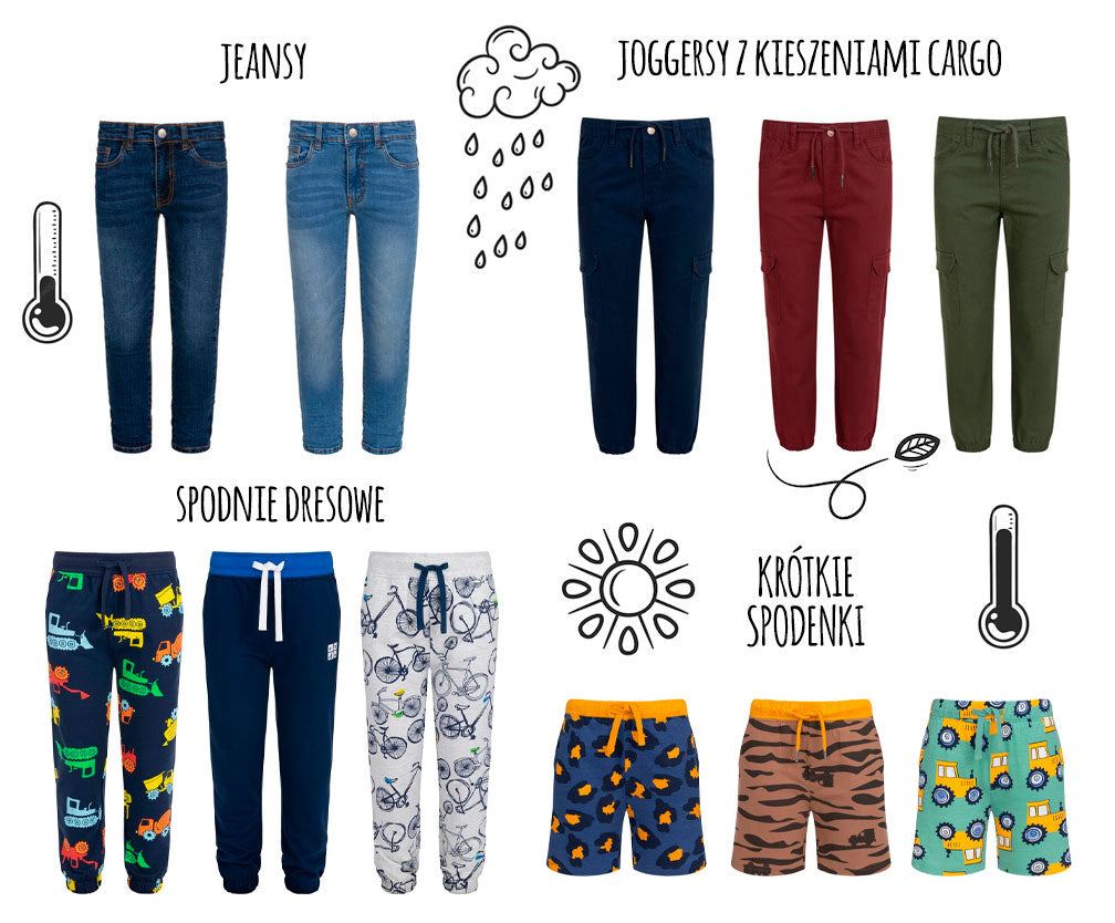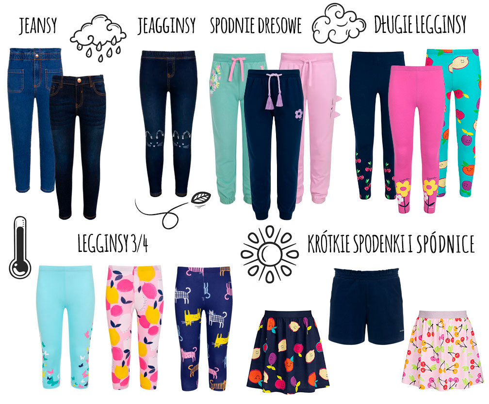 Jeśli planujesz aktywny wypoczynek na świeżym powietrzu, zadbaj o wygodne spodnie lub legginsy. Spodnie dresowe przydadzą się dziecku na bardziej wymagające aktywności, np. wędrówki po lesie. Zaletą są tu oczywiście także kieszenie, do których dzieci mogą schować znalezione na dworze skarby. Ciekawym pomysłem są spodnie z dodatkowymi kieszeniami cargo dające jeszcze więcej miejsca na drobiazgi co przyda się zwłaszcza podczas dłuższych wędrówek. Dziewczynki mają także opcję wybrania pięknych, kolorowych legginsów. Są one nieco cieńsze od spodni dresowych, dlatego sprawdzą się przy cieplejszej pogodzie i spokojniejszych spacerach.