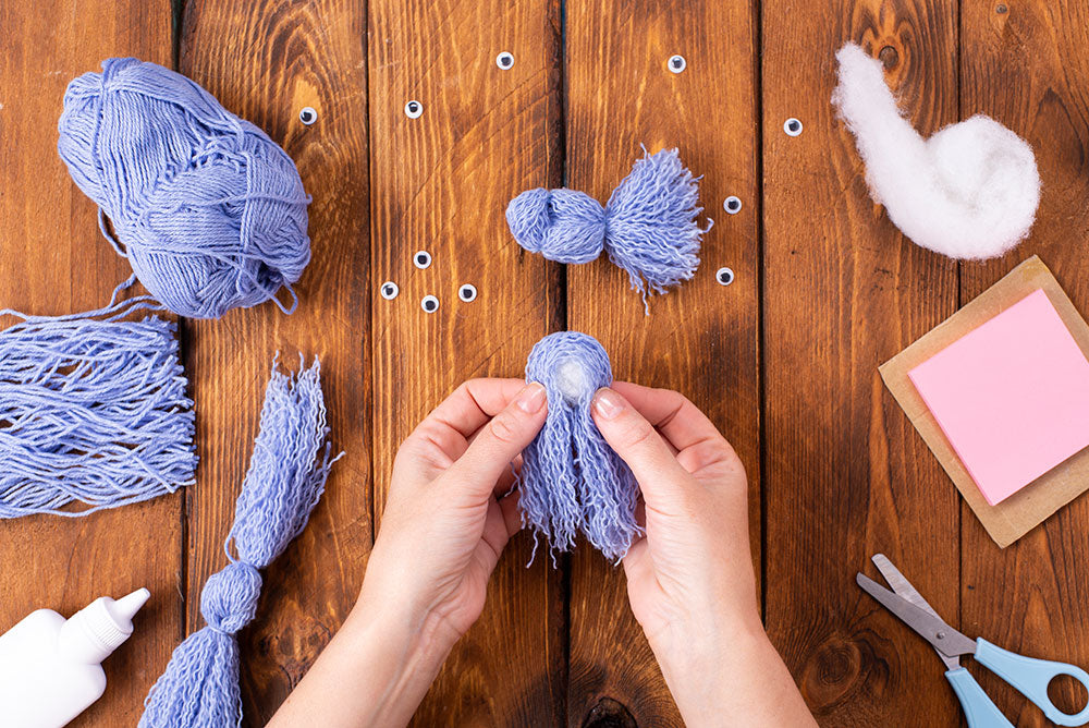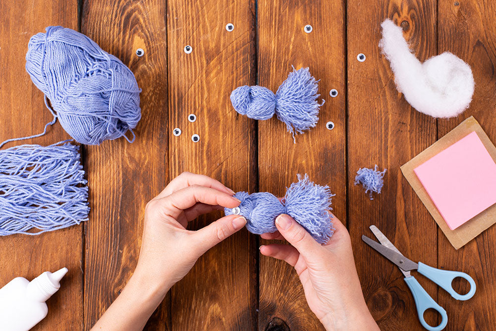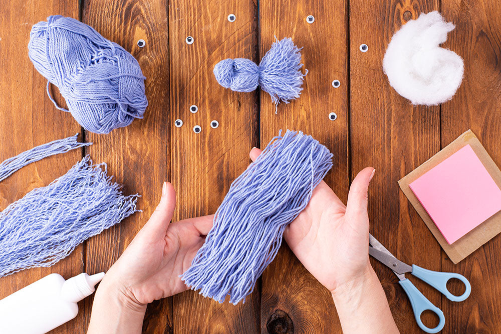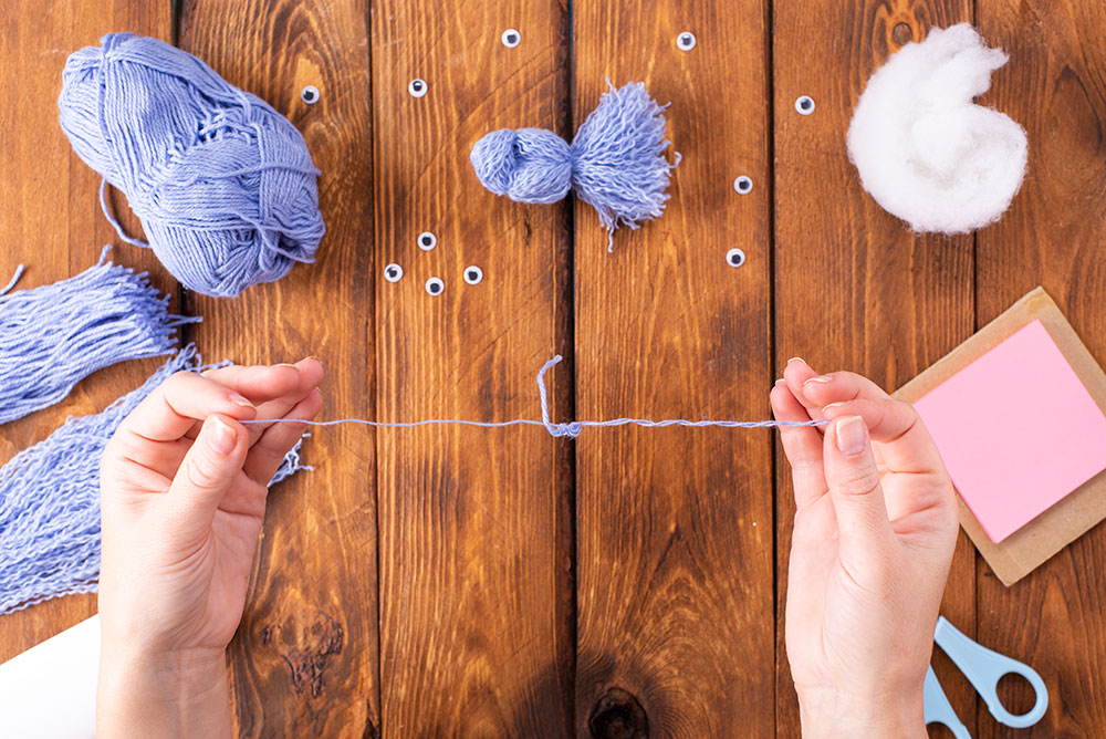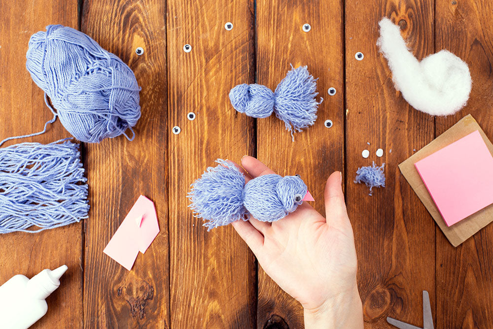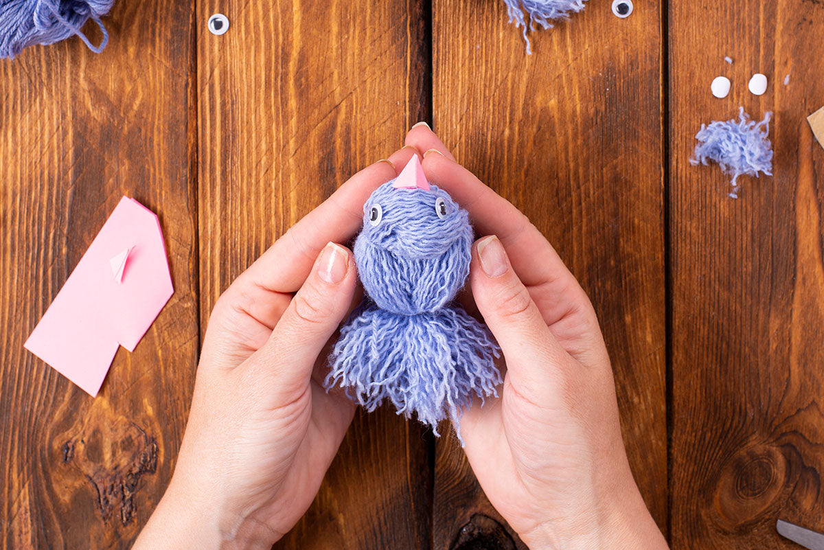 Ptaszek z włóczki jest gotowy! Spróbuj wykonać więcej pierzastych zwierzątek używając do tego różnych kolorów włóczki.