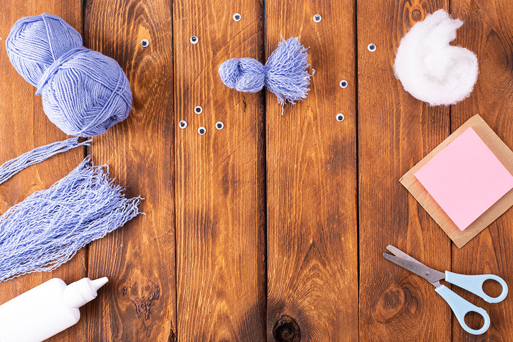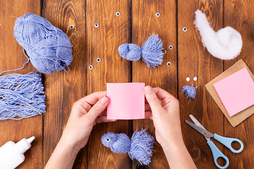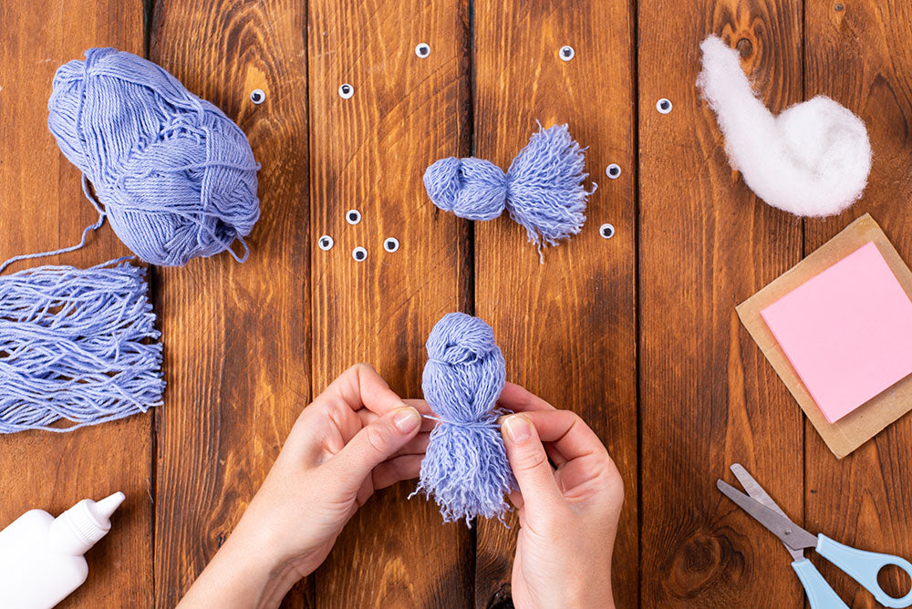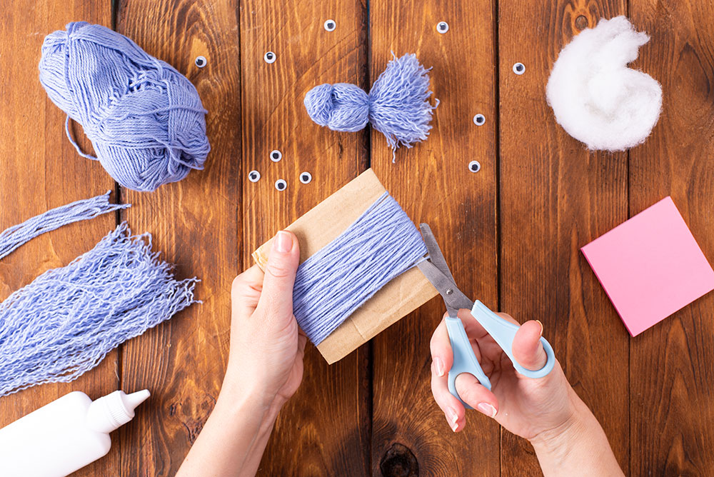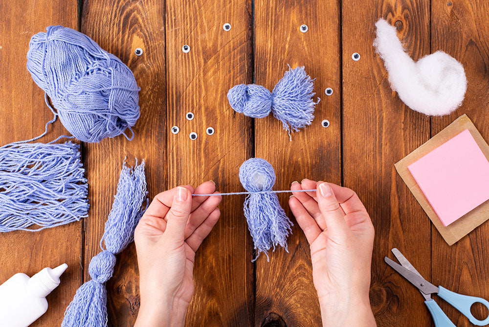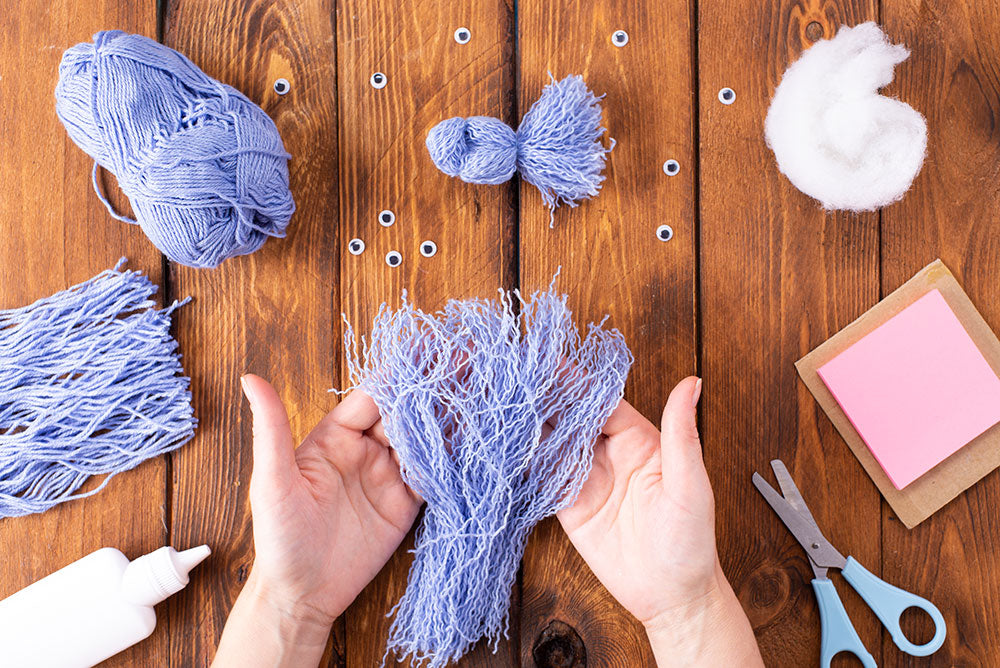Ptaszek z włóczki jest gotowy! Spróbuj wykonać więcej pierzastych zwierzątek używając do tego różnych kolorów włóczki.