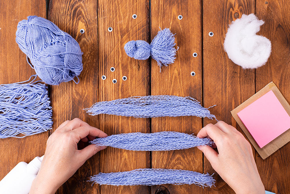 Przecinamy nawiniętą włóczkę w jednym miejscu tworząc równe pasma o tej samej długości.