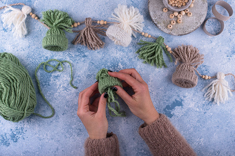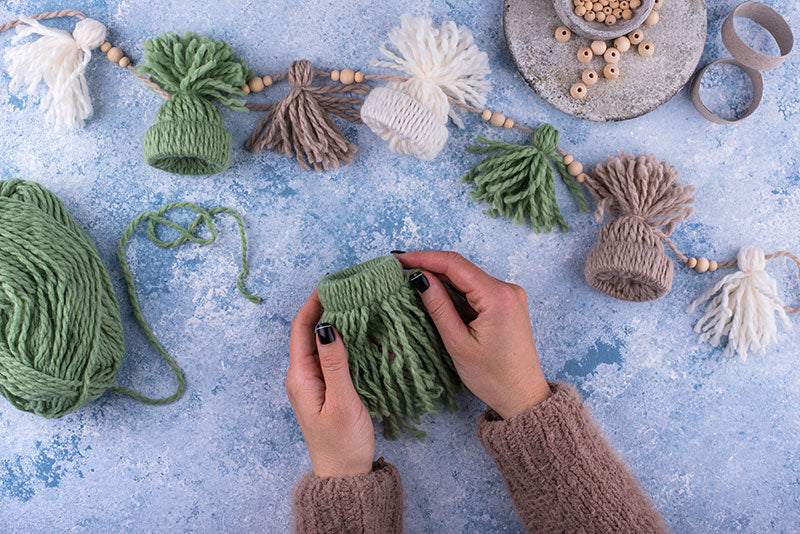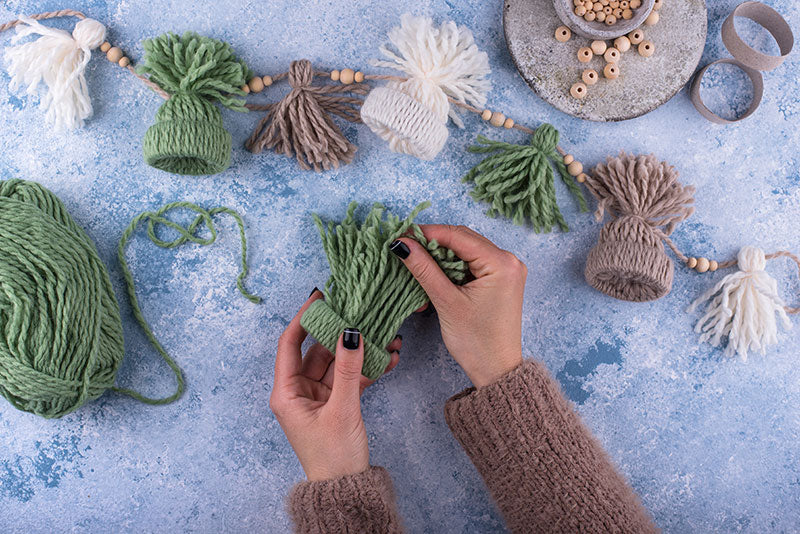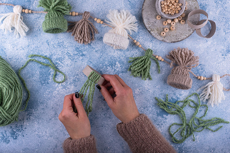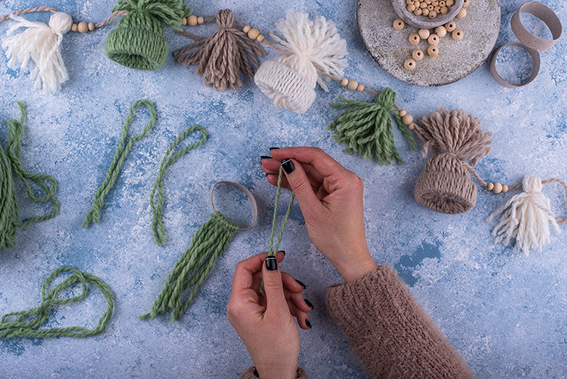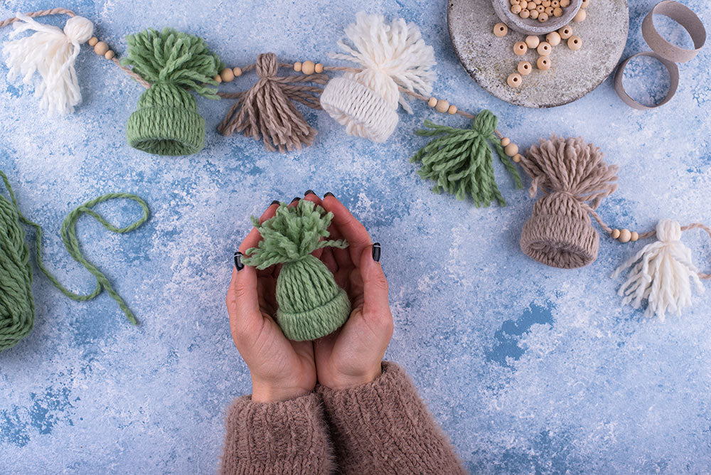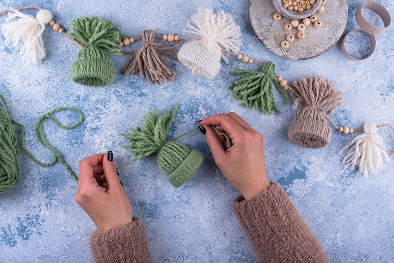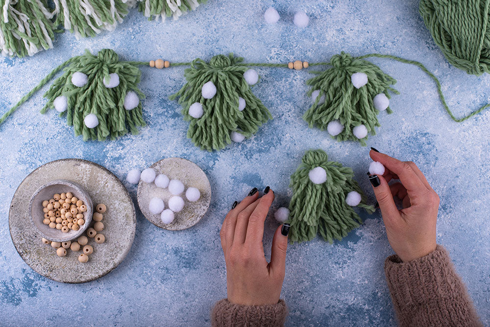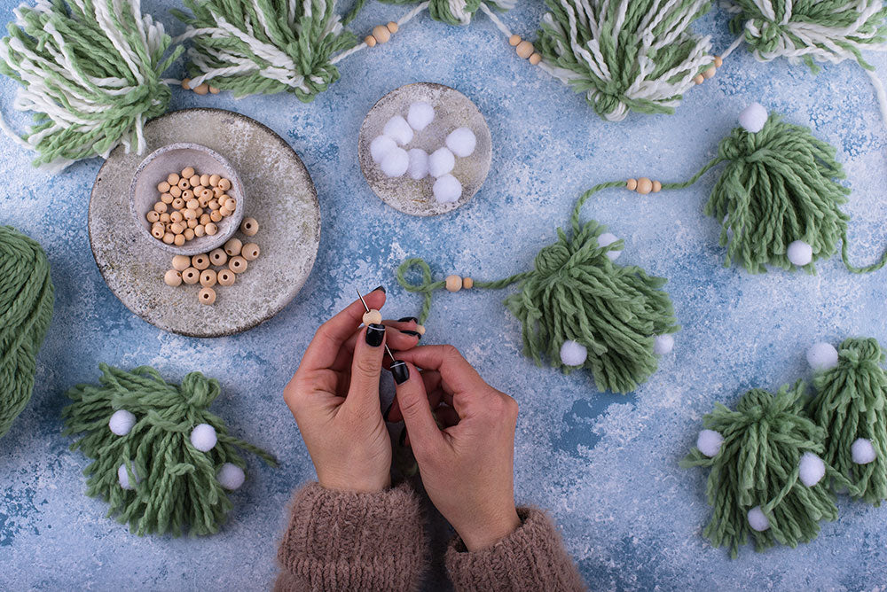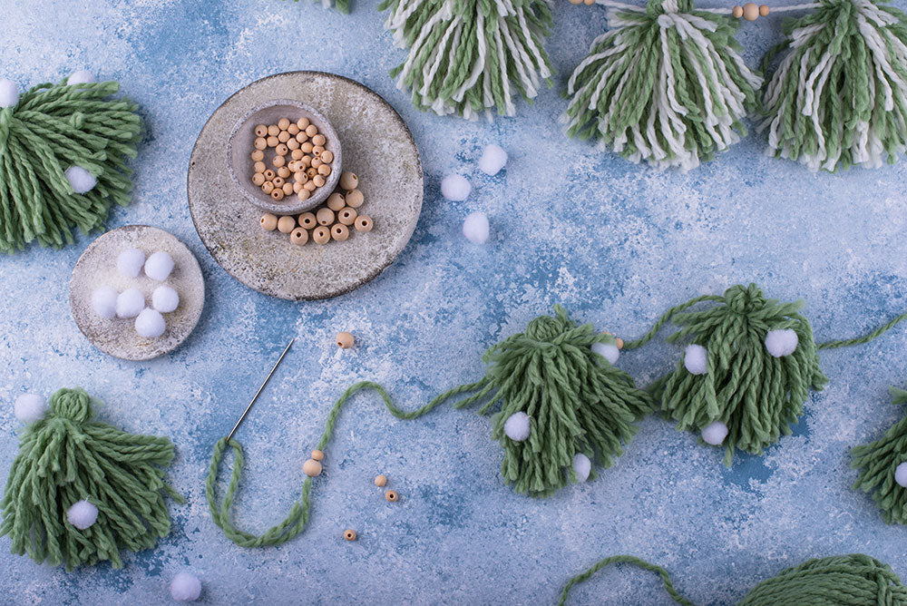 Między poszczególnymi ozdobami dodaj drewniane koraliki lub pompony.