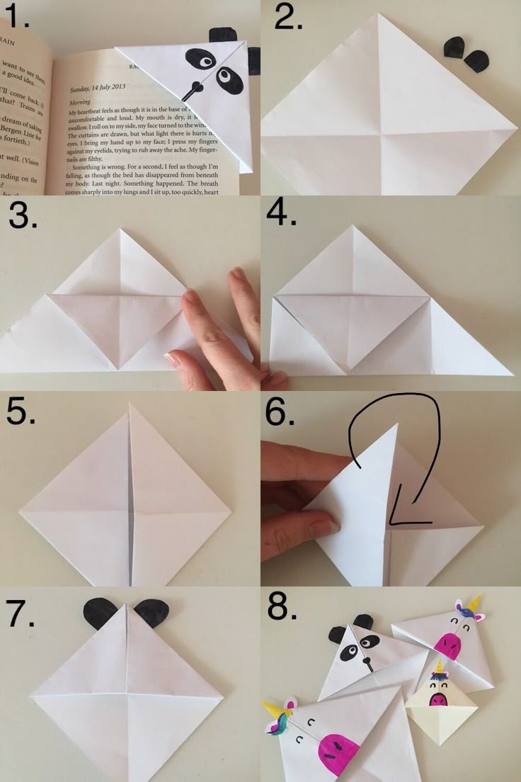 Jeśli masz ochotę, spróbuj zrobić zakładki w kształcie rogu, które zakładamy na rogi strony. Wystarczy kwadrat papieru, odpowiednio zagięty i ozdobiony. Świetnie nadają się do podręczników – będą trzymać stronę bez ryzyka zgubienia zakładki.