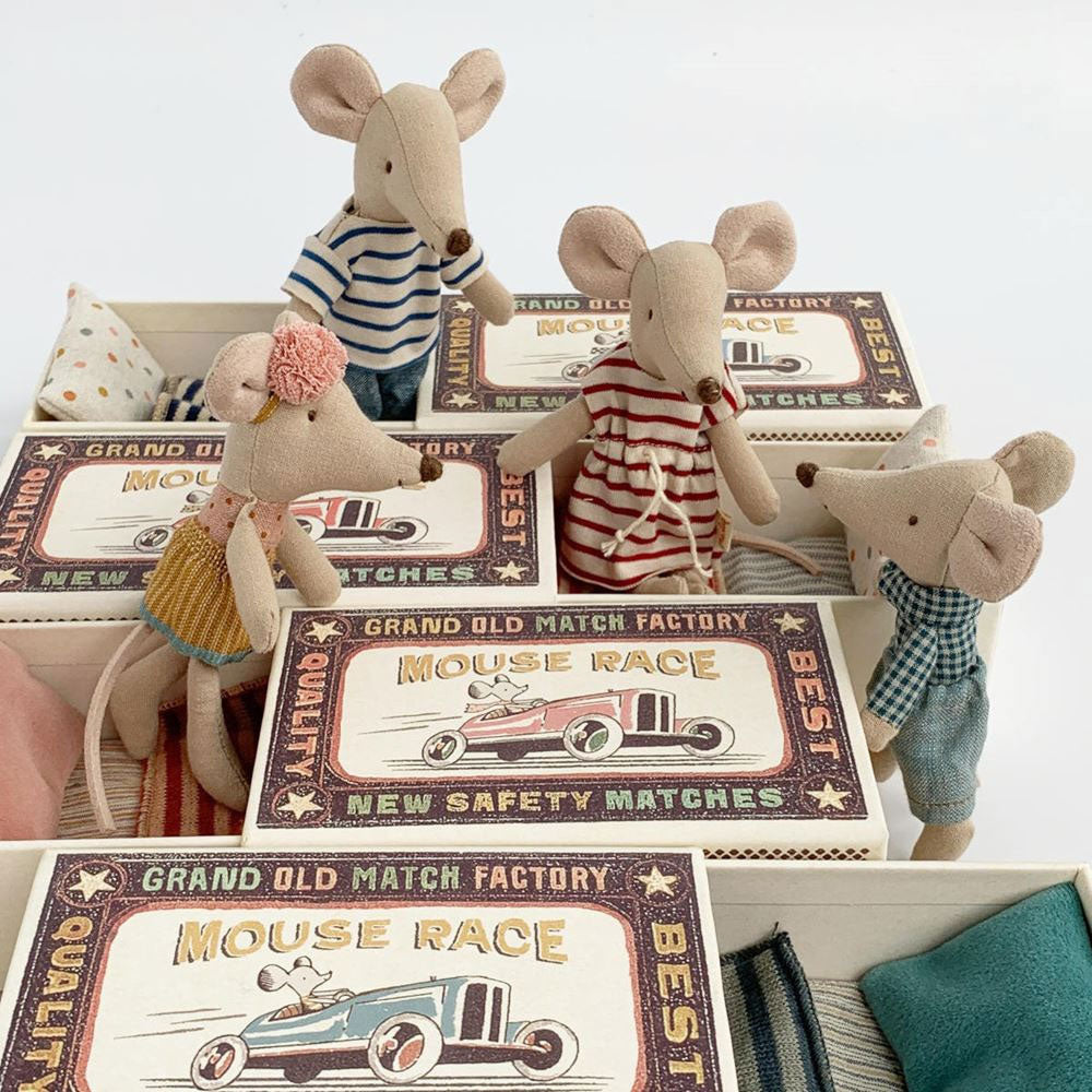 Urocze myszki Maileg to wspaniała zabawka w stylu vintage. Podstawowy zestaw jaki możesz podarować dziecku to myszka mieszkająca w pudełku, stylizowanym na stare pudełka po zapałkach bądź cygarach.