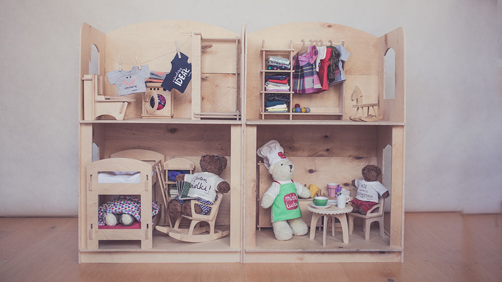 Przepiękne drewniane mebelki i domek zaaranżowane w pokoju dziecka będą nie tylko wspaniale wyglądać, ale staną się również ulubionym kącikiem do zabawy.