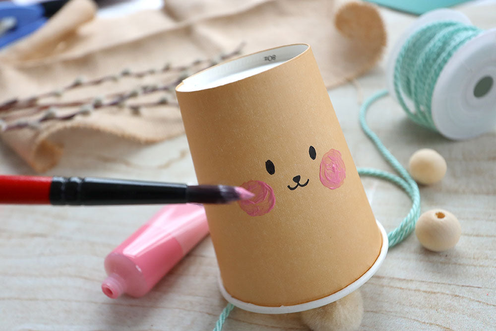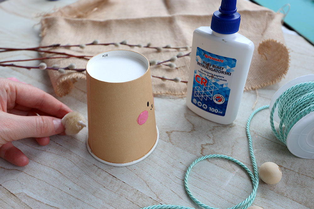 W kolejnym kroku przylepiamy z tyłu kubeczka pompon, który będzie króliczym ogonkiem. Dobierz kolor pomponu do swojego kubeczka. Do białego będzie pasował biały lub różowy, do beżowego brązowy.