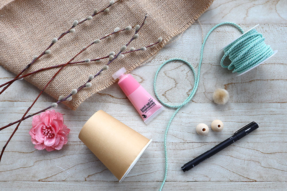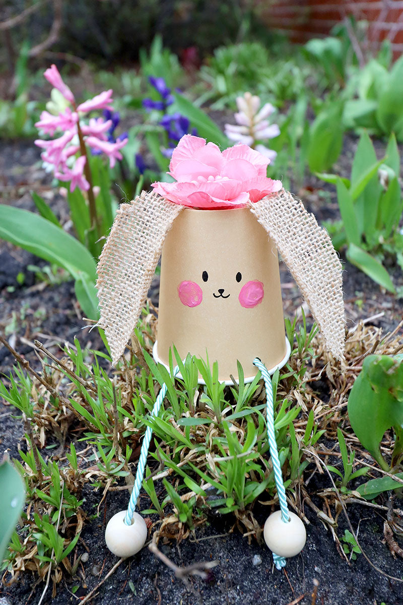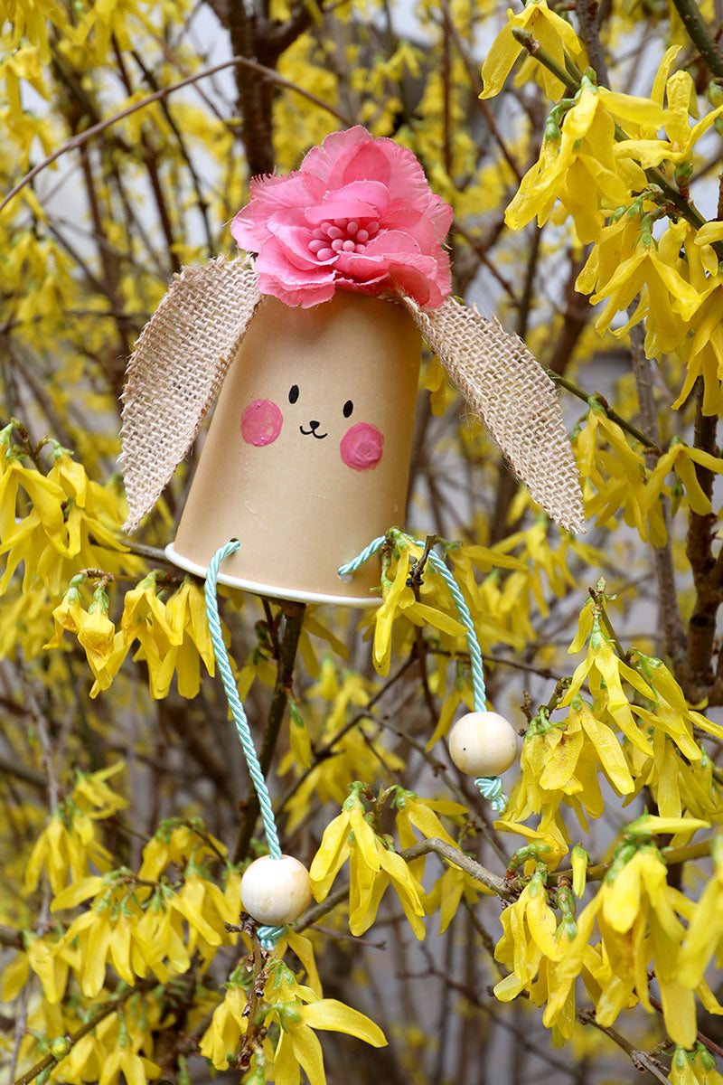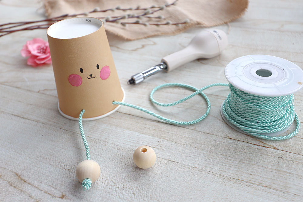 Czas na nóżki królika. Zrobimy je ze sznurka, dzięki czemu będą mogły zabawnie zwisać z półki, na której ustawimy naszą dekorację. Najpierw dziurkaczem robimy otworki na froncie kubeczka. Następnie przeciągamy sznurek przez oba otwory i dopasowujemy jego długość. Ostatni krok to nawleczenie drewnianego korala na każdą z "nóżek" i zabezpieczenie sznurków supłem.