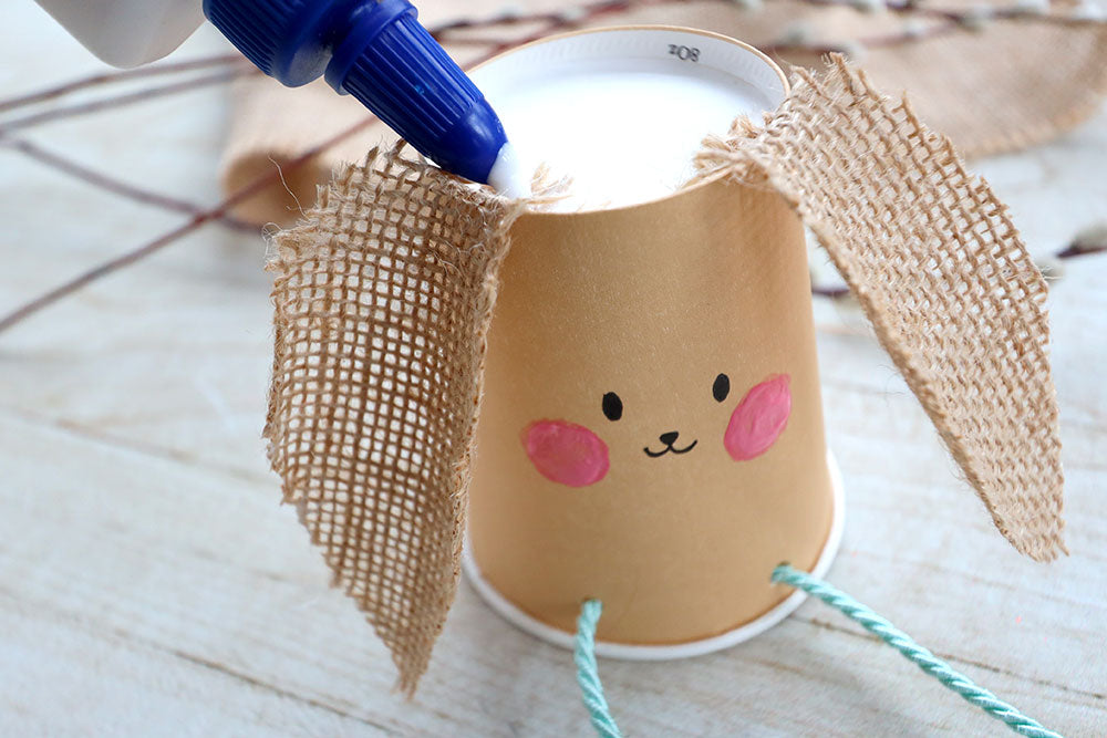 Czas na uszy zajączka. My zrobiliśmy je z juty, ale równie dobrze można stworzyć je z papieru kolorowego lub arkusza pianki plastycznej. Wytnij sporych rozmiarów uszy i przylep na dnie kubka. Jutowe uszy warto od brzegu zabezpieczyć transparentnym klejem, aby się nie rozpruły i posłużyły dłużej. Czubek "główki" można dodatkowo zabezpieczyć okrągłym kartonikiem, który naklejamy na dno kubka, tak aby zakrył całe dno łącznie z końcówkami uszu.