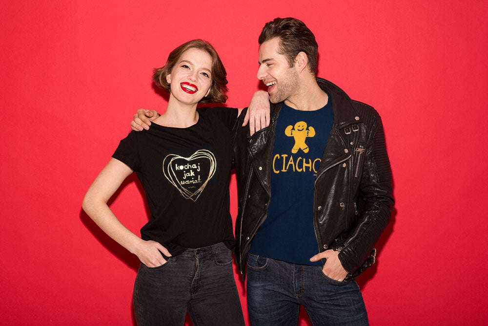 Jeśli pasujące do siebie koszulki to nie Wasza bajka możecie kupić swojej połówce t-shirt z indywidualnym wzorem, np. z napisem “Ciacho” albo “Ostra babeczka”.
