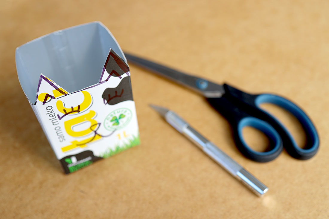 Podstawą pojemników będą kartony po mleku lub sokach. Mają one tę zaletę, że są wytrzymałe i nieprzemakalne a od środka mają elegancką srebrną powierzchnię. Pamiętaj o umyciu i osuszeniu kartonów przed przystąpieniem do pracy.