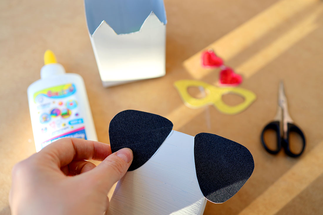 Uszy naklejamy na pudełko psa. Reszta elementów musi poczekać na sam koniec.