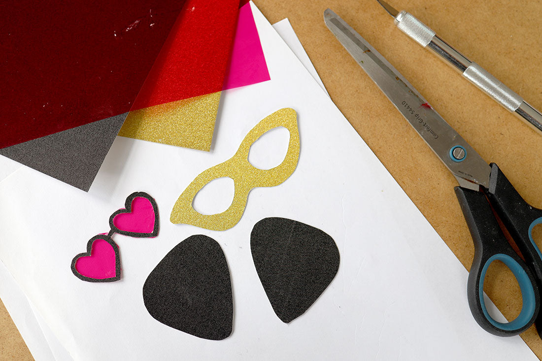 Pora na akcesoria. Ze złotego brokatowego arkusza wycinamy maskę kota, a z czarnego uszy psa i ramę okularów. Z czerwonej folii wycinamy szkła okularów i przylepiamy do ramki.