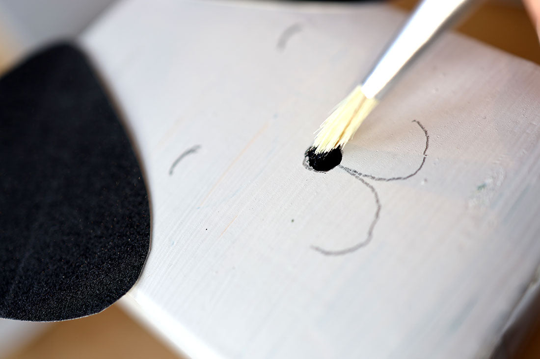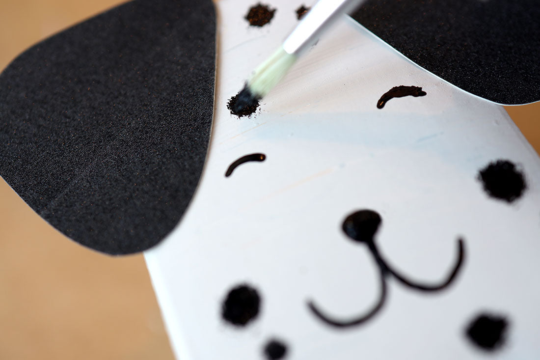 Pora na malowanie. Na białym pudełku malujemy czarną farbą oczy i mordkę pieska a także plamki na jego sierści. Na czarnym pudełku białą farbą malujemy, oczy, mordkę, uszy i wąsy kotka.