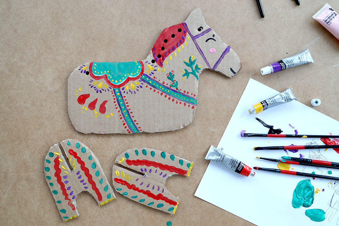 Z kartonu wycinamy tułów konia wg ilustracji przedstawiającej oryginalne koniki Dala. Kolejnym etapem jest wycięcie nóg dzięki czemu nasz obrazek zamieni się w trójwymiarową figurkę. Rysujemy łuk, w środku którego wycinamy szczerbę o szerokości kartonu, w którą wsuniemy górę konia. Od dołu wycinamy kolejny mniejszy nóg rozdzielający nogi konia. Kształt odrysowujemy i wycinamy kolejną parę kopyt wg wzoru.