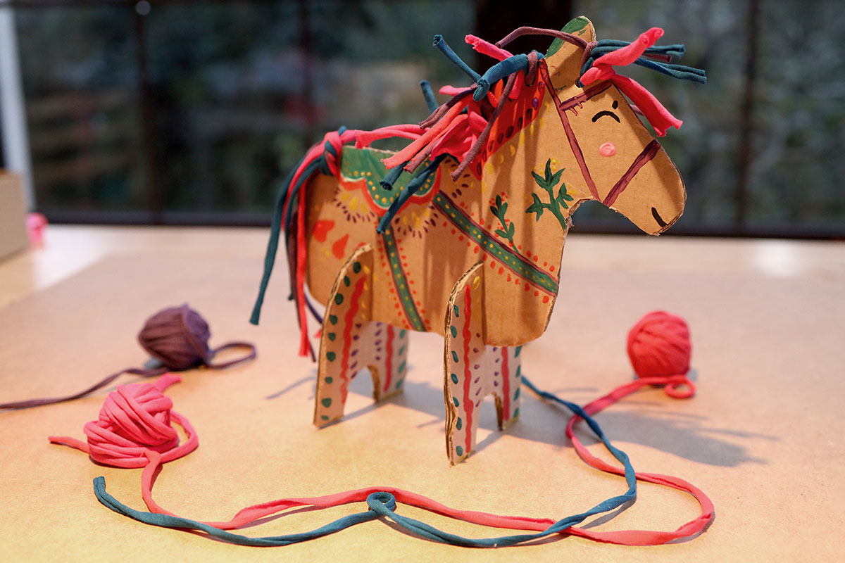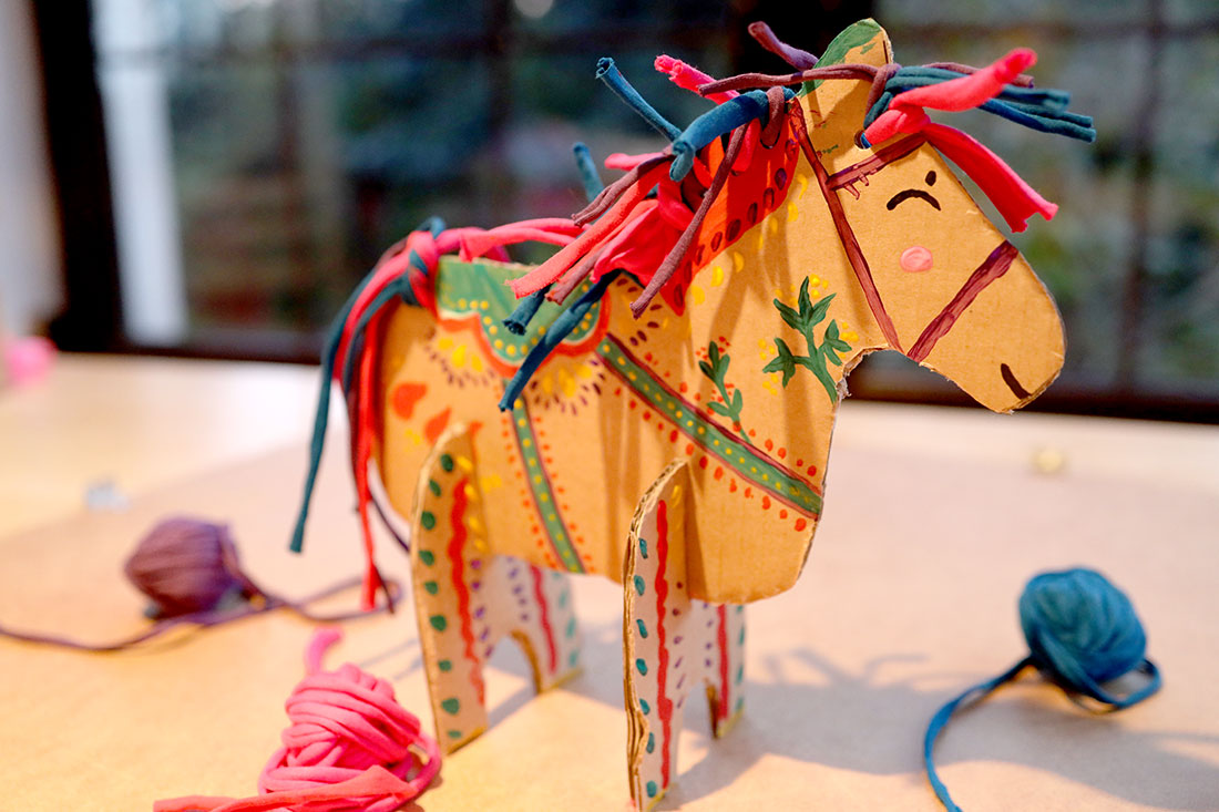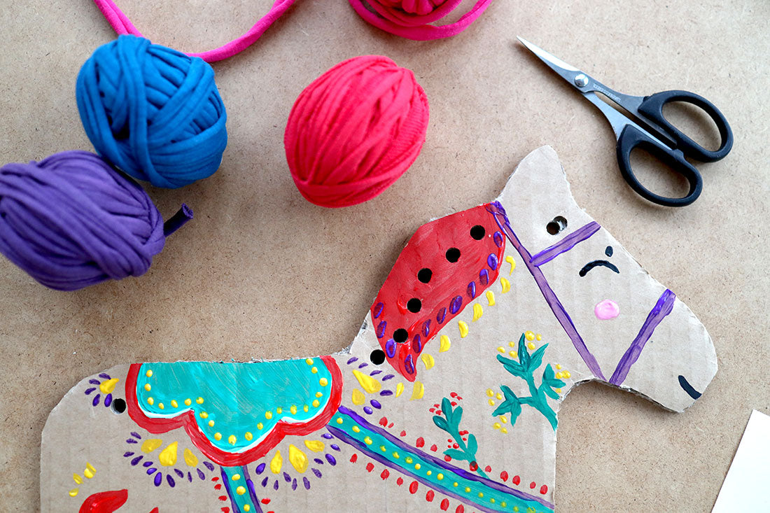 Aby konik był gotowy do postawienia na półce brakuje mu jeszcze grzywy i pięknego ogona. Możesz wykonać je z bawełnianego sznurka, włóczki lub wstążek. Przepleć kawałki sznurka przez zrobione wcześniej dziurki i bujna fryzurka kucyka gotowa!