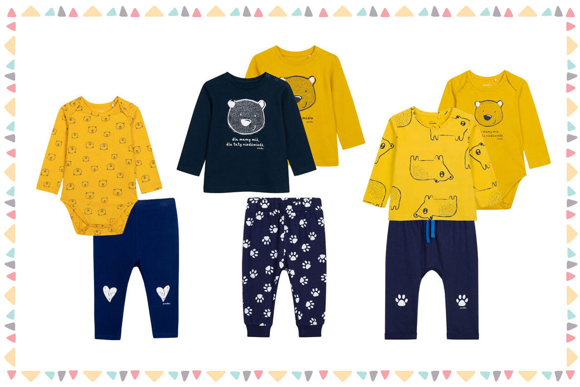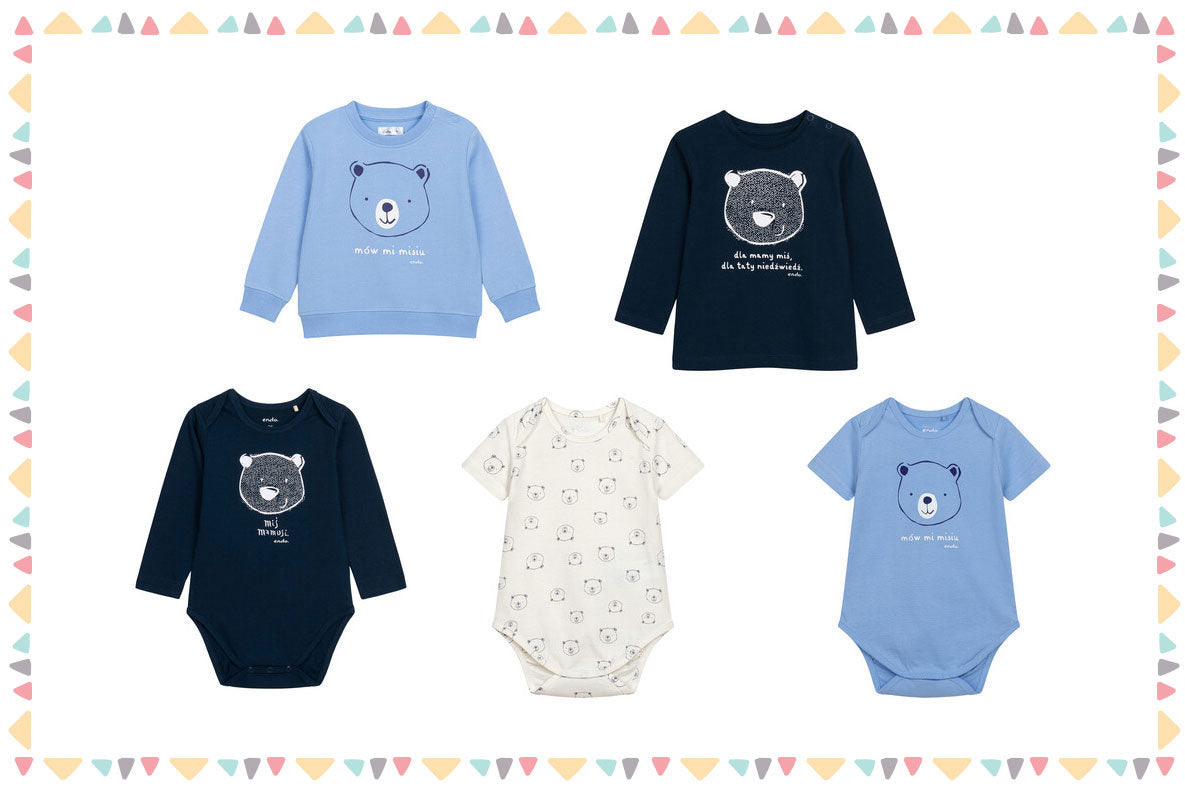 Planując wyprawkę możesz również utworzyć zestawy z ubranek z tym samym motywem misia, ale dopasowując do siebie różne kolory.