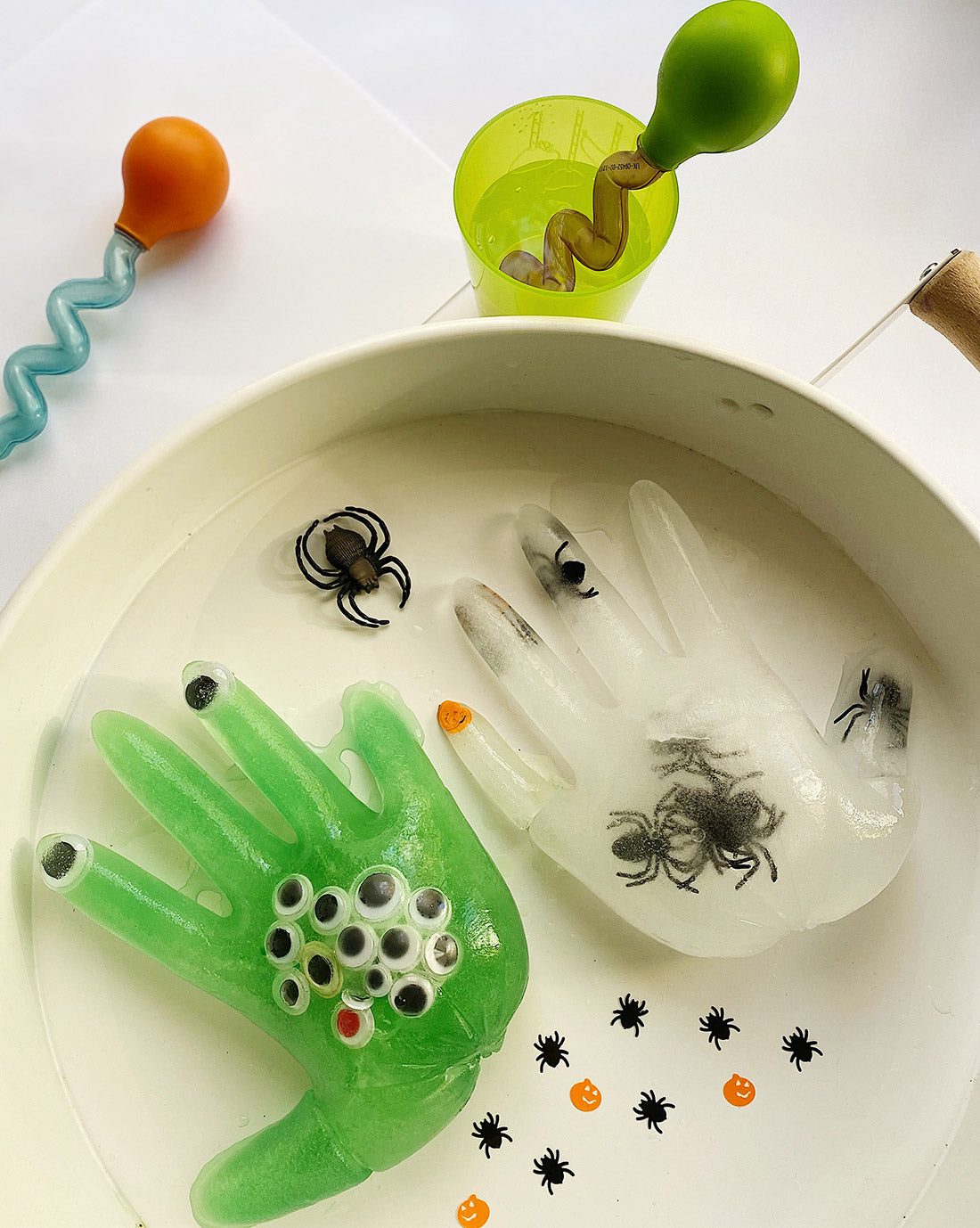 Zabawy z lodem należą do ulubionych aktywności wszystkich dzieci. Zaproś najmłodszych na sensoryczną przygodę z lodowym tematem w roli głównej. Zamrożone dłonie z pewnością zaskoczą swoją nietypową formą i będą idealną niespodzianką na halloweenową zabawę.